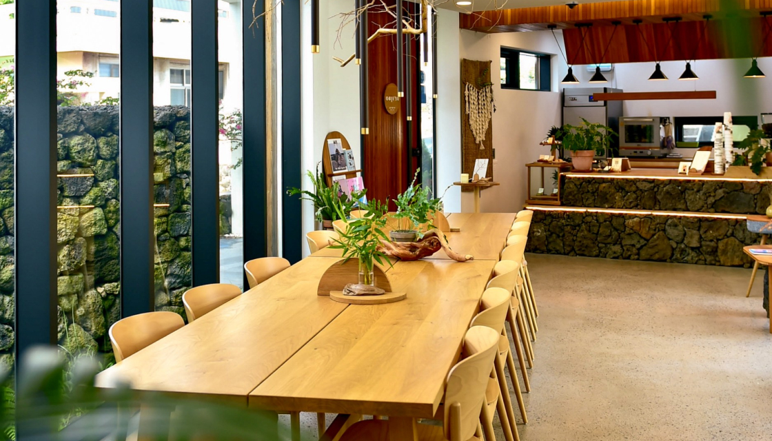 - 크게 3개의 공간으로 나뉘는 실내공간은 각각의 공간이 가진 구조적 특징에 따라, 인테리어에 변화를 주어, 같은 카페 내부이지만, 마치 다른 공간을 이동하는 듯한 느낌을 받으실 수 있습니다. 그 중 현무암과 제주 바닷가에서 직접 채집한 유목을 소재로 만든 유니크한 오브제 제품들이 전시된 쇼룸은 카페 공간을 이용하시는 손님들께 또 다른 볼거리를 선사하고 있습니다.