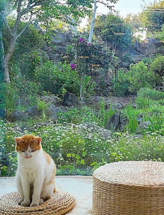 바깥으로는 정원이 펼쳐져 있는데, 카페 뒷뜰에 있기에 아까울 정도로 잘 가꾸어져 있어요. 가만히 풍경을 바라보다보면 카페와 정원을 넘나드는 고양이들도 볼 수 있어요. 느긋하고 평화롭죠. 풀멍도 좋고 독서도 좋아요. ‘제주스러운’ 카페란 이런 곳 아닐까요?