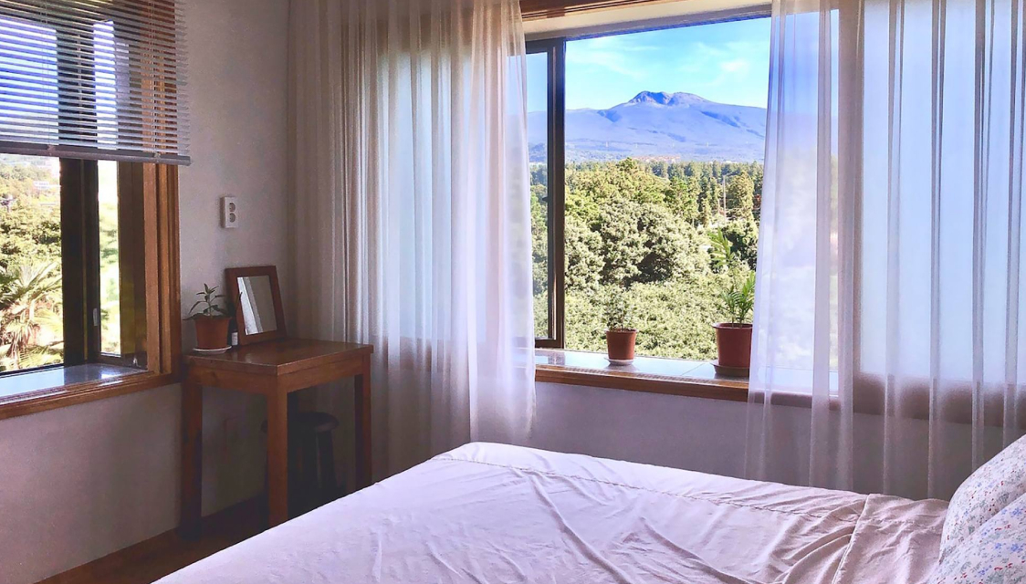 - 숙소에서 창 밖 가득 펼쳐지는 드넓은 귤 밭과 시원한 한라산 능선