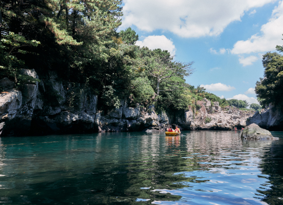 한라산에서 흘러내린 효돈천의 담수와 해수가 만나 생긴 깊은 웅덩이 쇠소깍에서 전통 테우와 카약을 타보세요.