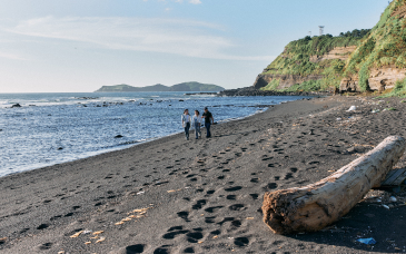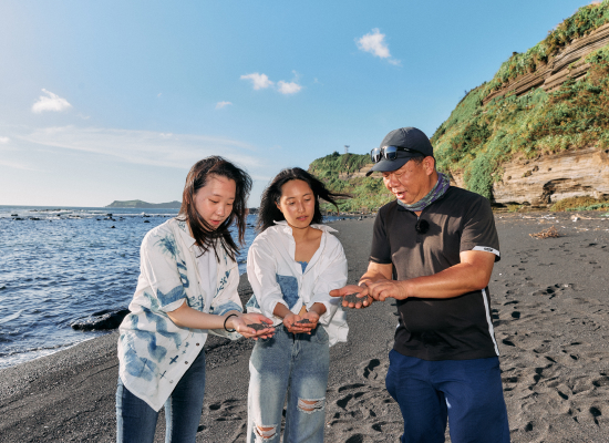 화산 퇴적물이 쌓여 만들어진 검은모래 해안 절벽을 따라 이어지는 지질트레일을 경험하세요.