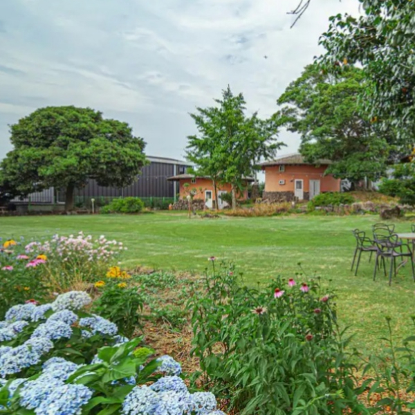저희는 제주 토박이로 귤 농사를 짓는 농부 부부예요. 고양이를 좋아해서 마당에서 고양이와 함께 살고 있어요. 또 꽃을 좋아해 넓은 잔디 마당을 가꾸며 꽃을 심어 키우고 있어요. 이 잔디 마당에서는 요가도 하고 아이들의 운동장이 되는 곳이에요.