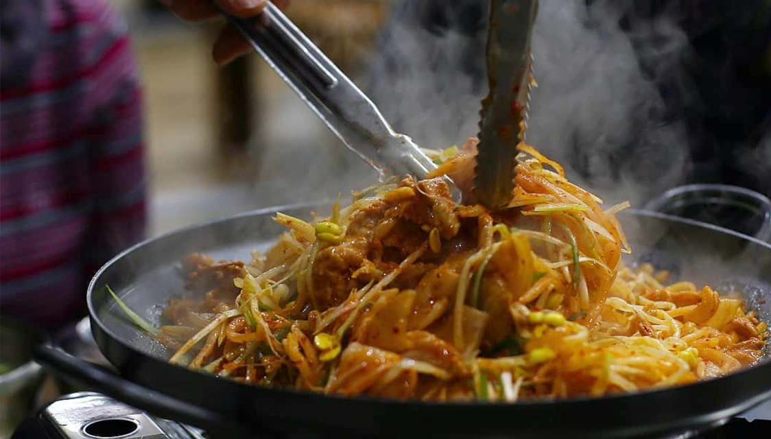 콩나물, 무생채, 파채를 듬뿍 넣어 자박자박 끓인 제주식 두루치기 전문이예요.