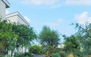 - 푸른 잔디와 꽃들로 가득한 예쁜 정원, 그 한가운데 우뚝 선 거대한 올리브나무