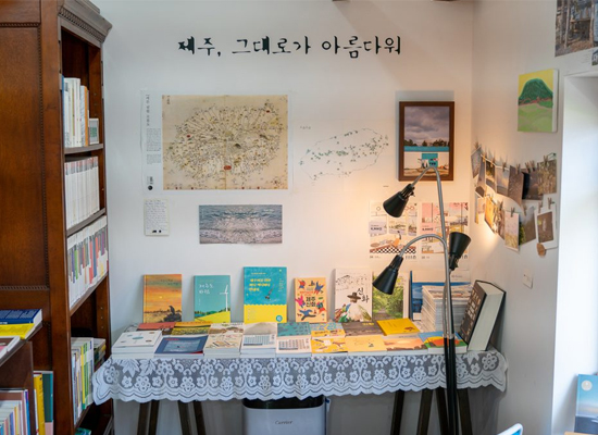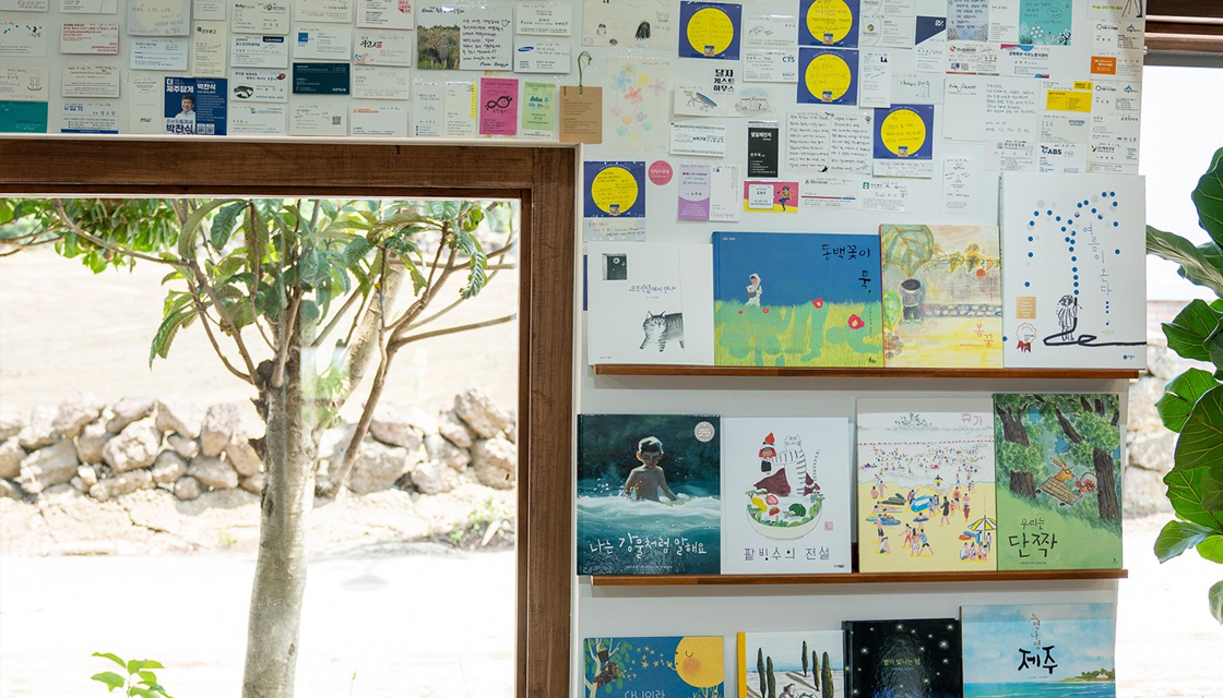 제주풀무질은 인문사회과학 책방이에요. 책은 2,500권 남짓 있는데, 인문사회과학, 제주 관련, 시/소설/산문/고전/철학, 어린이 손님을 위한 그림책 그리고 생태/평화/인권/나눔, 크게 5가지 주제로 모아 두었어요.