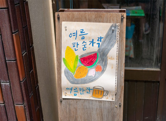 아담한 시골 초등학교 옆에 자리한 여름 문구사는 아이들보다 키덜트 취향을 저격하는 독특한 공간입니다. 숨바꼭질이라도 하듯 눈여겨보지 않으면 그대로 지나칠 수 있습니다. ‘중앙농약종묘사’ 간판과 함께 귀여운 수박이 붙어있는 벽돌 건물이 보인다면 제대로 찾은 것이니 안심해도 됩니다. 삐뚤삐뚤한 손 그림이 인상적인 입간판은 매번 다른 그림과 글귀로 여행객을 맞지요. 덕분에 몇 번을 다시 찾아도 늘 새로운 느낌입니다. 취향 저격 입간판에 슬며시 입꼬리가 올라갑니다.